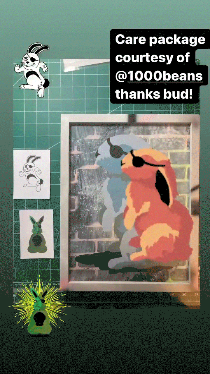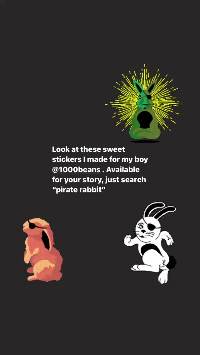 Drew York is a street artist and muralist living in Milwaukee. As a street artist, he has what is essentially a logo: the pirate rabbit. That is his mark. When you see a pirate rabbit stenciled or wheat pasted, that is Drew. Other than getting up in the streets, Drew’s main outlet for brand marketing is his Instagram. How can Drew give his followers, buyers, and fans a little extra delight? Instagram stickers.